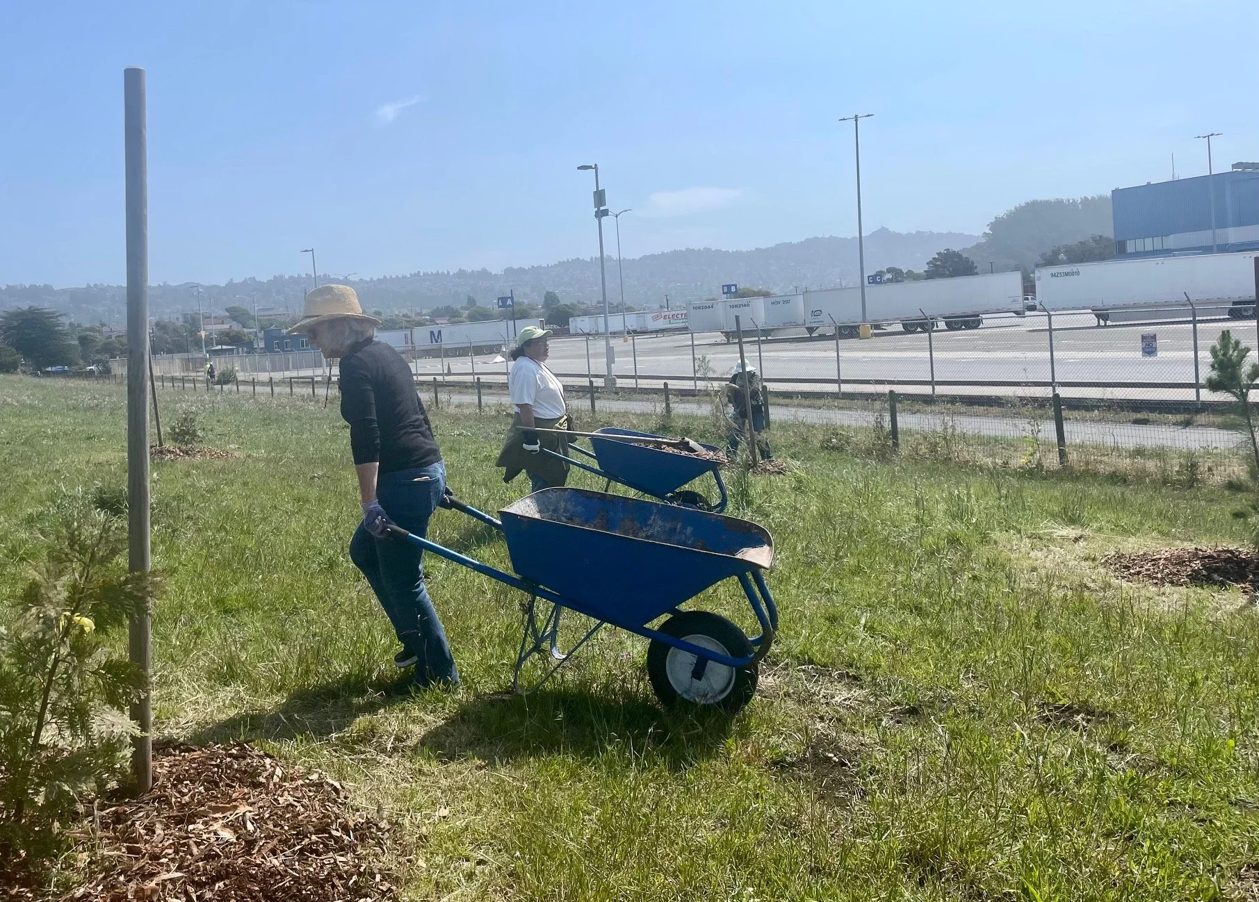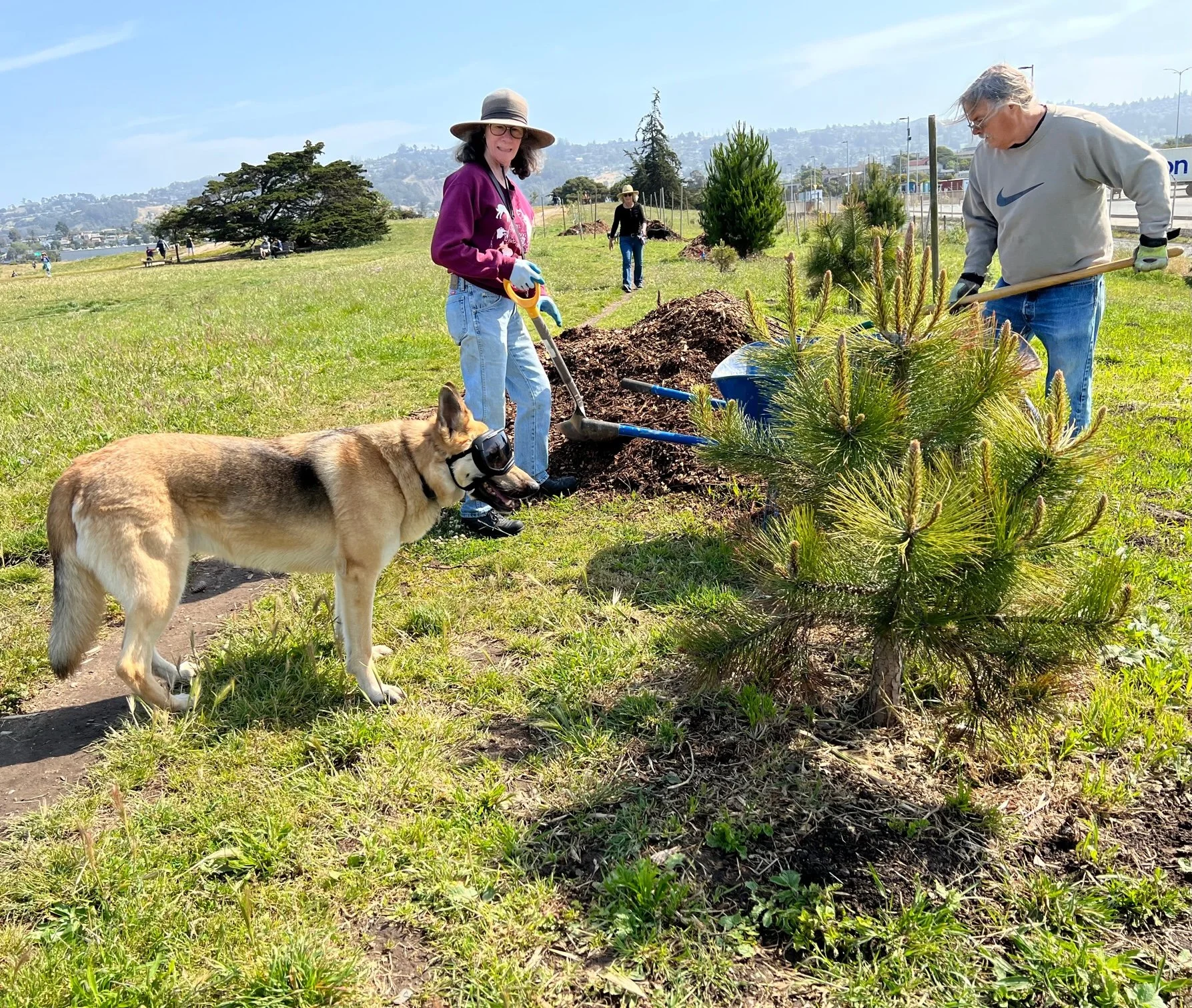 Point Isabel Regional Shoreline’s mini forest got some Tender Loving Care on Earth Day weekend (April 24, 2022) from PIDO members and the UC Berkeley Prytanean Women's Honor Society. The hardworking crew mulched some two dozen young trees along a large swath adjacent to the bike path. East Bay Regional Park District supervisor Scott Possin provided wheel barrows, shovels, rakes, hoes, and rich landscaping know-how. As the trees grow, they will soften the industrial view of the U.S. Post Office’s bulk mail distribution center. Thank you to everyone who pitched in.